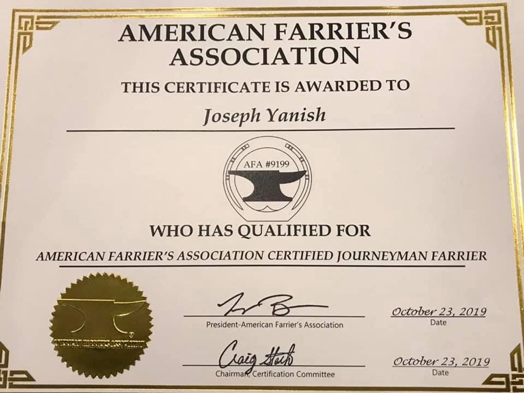 Farriers who pass the AFA Certified Farrier examination exhibit a working knowledge of anatomy, physiology, pathology, gaits, and horseshoes and their various uses. They display the ability to identify, assess, trim, and protect, structures of the hoof. They demonstrate shoe fit and modifications to specific standards and patterns." ~ AFA